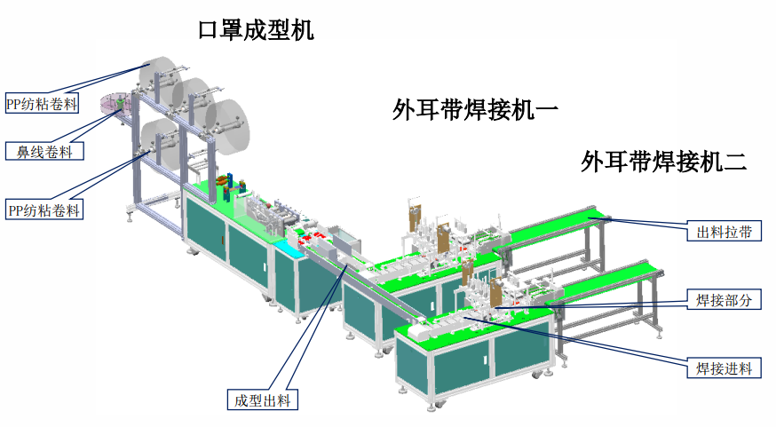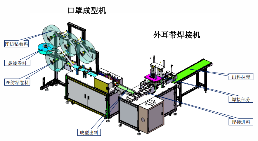 本設(shè)備主要生產(chǎn)平面口罩,由口罩成型機(jī)和外耳帶焊接機(jī)組成。從原材料卷料自動送料、鼻線插入、截?cái)?、超聲波熔合、口罩自動裁斷、耳帶上料及焊接等均全自動完成?/span>