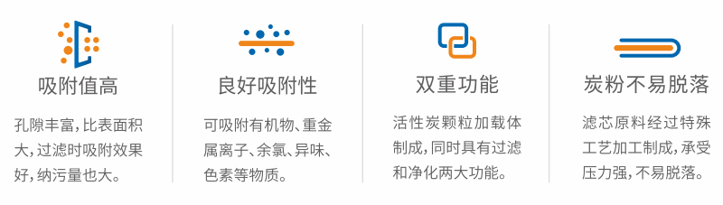活性炭濾芯選用高品質(zhì)活性炭作為主要原料,采用自動化設(shè)備壓縮成型,然后加配無紡過濾布及聚乙烯防護(hù)網(wǎng)組裝而成。